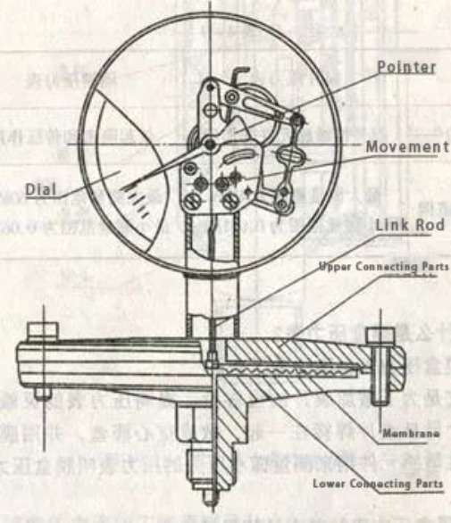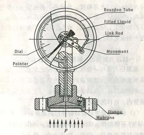 Kada mjerač tlaka dijafragme mjeri tlak, izmjereni rad rada izravno djeluje na izolacijsku dijafragmu. Dijafragma prolazi kroz deformaciju prema gore. Srednji tlak se prenosi na opružnu cijev kroz tekućinu za punjenje unutar opružne cijevi, uzrokujući da kraj opružne cijevi prođe elastičnu deformaciju. Uz pomoć mehanizma povezivanja, osovina zupčanika mehanizma tjera se da se okreće, što uzrokuje da pokazivač navede izmjerenu vrijednost tlaka na skali.