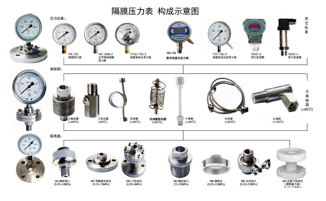 Glava mjera ove vrste instrumenta može se koristiti u različitim serijama: opći mjerač tlaka, mjerač tlaka otpornog na udarce, razni mjerač električnog kontaktnog tlaka, razni mjerač električnog kontaktnog tlaka otporan na udarce, odašiljač tlaka, mjerač udaljenog tlaka, digitalni mjerač tlaka, regulator tlaka i tako dalje.